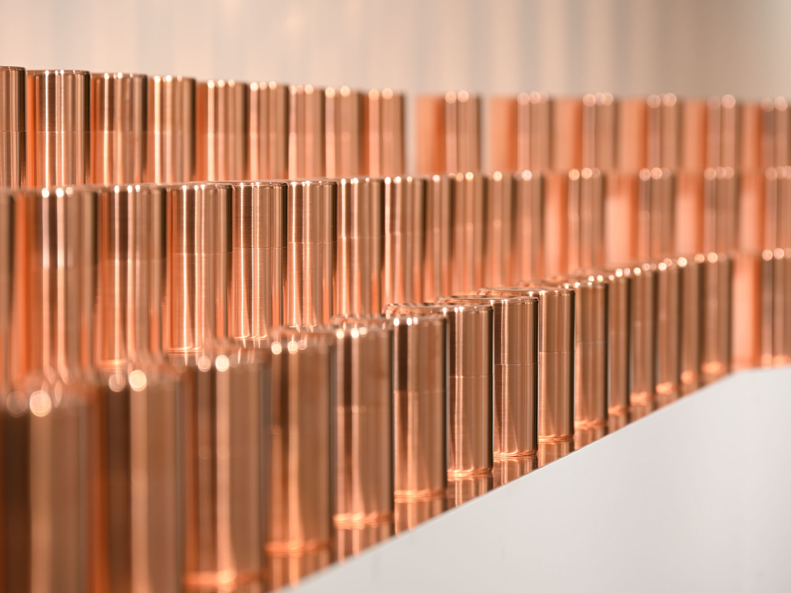 緑青の銅板が歴史を物語る6代目以前の「過去」の茶筒、創業150年にちなみ150本が並ぶ圧巻の「現在」、そして新たな可能性を秘めた「未来」の品々。