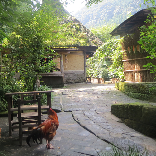 Myoken Hot Spring is located a 15-minute drive from Kagoshima Airport, on the foot of the Kirishima Mountain Range, which is famous for the legend of Tensonkorin (the descent of the grandson of the sun goddess to earth). The Amori River runs through a vast volcanic ash plateau and carved the valleys to cradle bathing resorts like Myoken. Historical celebrities such as Ryoma Sakamoto and Takamori Saigo visited here to enjoy the outstandingly famous quality and yield of Myoken spring water. In this location Wasure no Sato (Village of Forgetting), Gajoen is equipped with thatched roofs and hearth and actively preserves a quiet traditional lifestyle. What we have here are Guest rooms under the thatched roofs of relocated farmers’ houses, The cock crowing in the morning, Just-picked fresh vegetables and eggs, Rice cooked on a firewood stove and miso soup with tons of ingredients Somehow everything has a smell of nostalgia here. Men and women, young and old, all work together in nourishing nature and being sustained by it one year after another.
