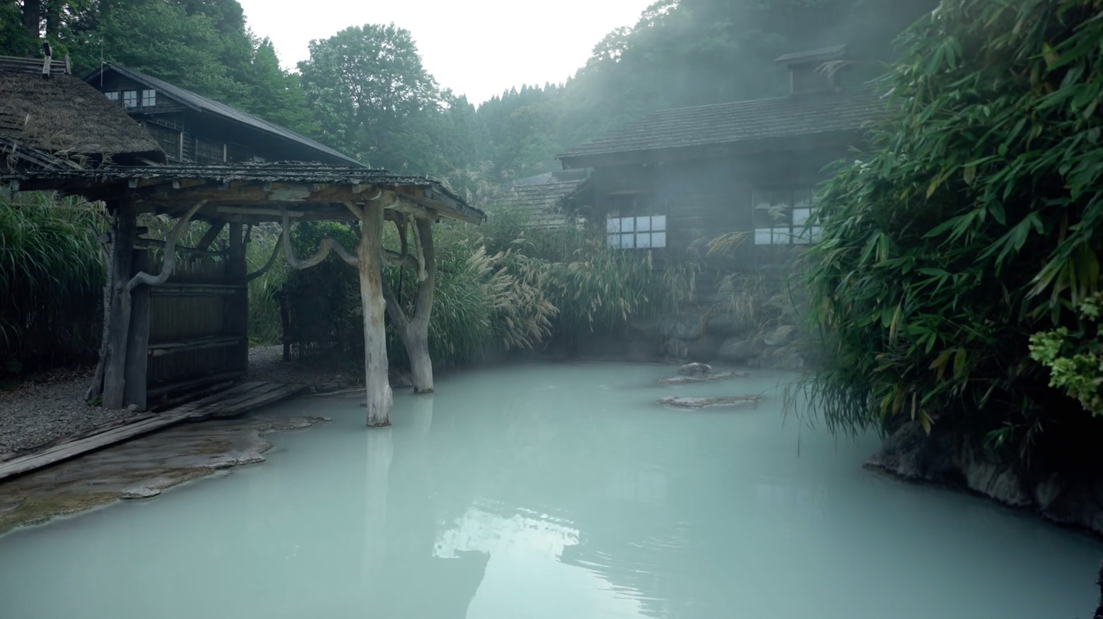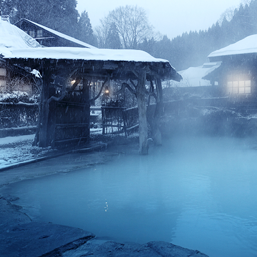 Nyuto hot spring is located in the highlands on the way from Lake Tazawa to the foot of Mount Akita Komagatake. The name Nyuto comes from Mount Nyuto, a mountain shaped like a woman’s breasts. Fabulous milky-white water is gushing out in Nyuto. “Tsuru no Yu”is the oldest inn in Nyuto hot spring with 15 generations of history for almost 400 years. An antique thatched-roofed farmhouse welcomes contemporary visitors just as the Lord of Akita Clan was when he visited here in 1638. On the hearth the pot is heated, and Japanese yam in rich Akita flavor are served. Milky-white hot spring bathing takes place out of doors with minimalist buildings, such as a natural-wood gazebo, humble wooden changing facility, and modest fences. In winter, the entire inn is buried under heavy snow. White, turbid, hot water has a delicate translucency which proves to be effective in curing the body. Mysterious and enigmatic. Power and wisdom always belong to Nature, and we humans receive a small portion which is just enough for our survival: You cannot help believing this is true here. Therefore, this is the place for Japanese people to feel their ancestral, spiritual landscape.